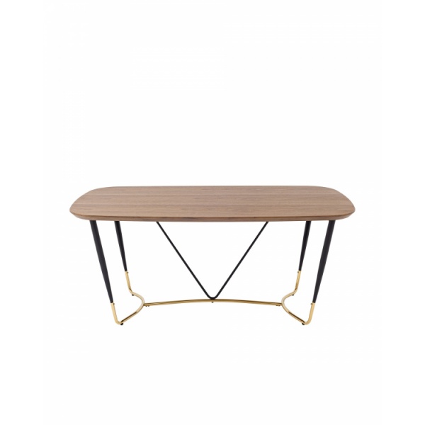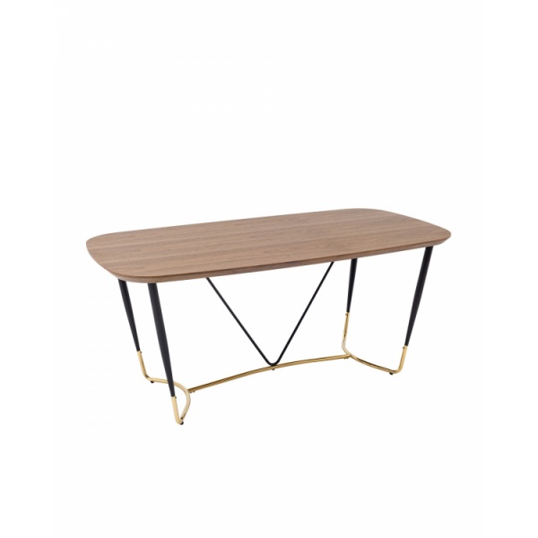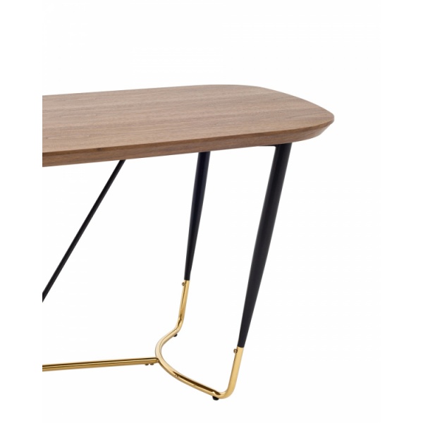 Стильный обеденный стол Даймакс. Прямоугольная столешница с закругленными углами выполнена из МДФ и покрыта шпоном цвета дуба. Придает столу сдержанный вид, создает ощущение уюта и тепла. Металлический каркас в черно-золотом цвете гармонично сочетается со столешницей. Выдерживает нагрузку до 100 кг, основание оснащено подпятниками для предотвращения порчи напольного покрытия. Стол Даймакс дополнит любой современный интерьер кухни или зала.