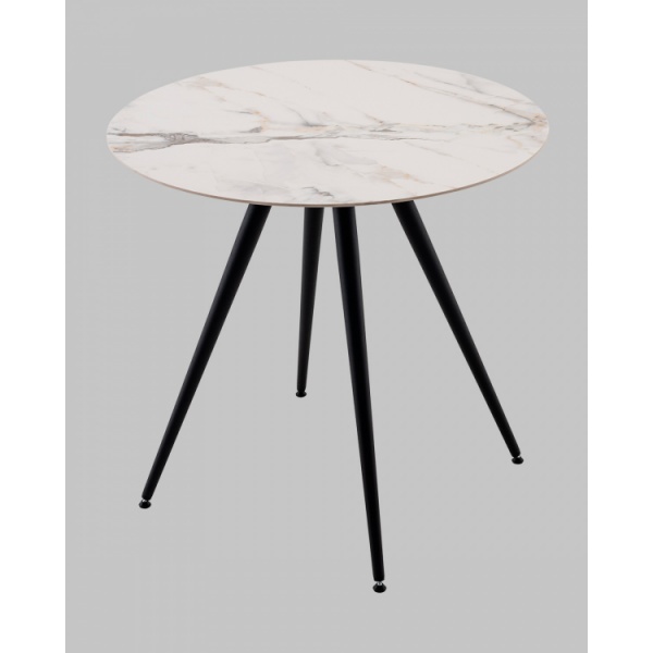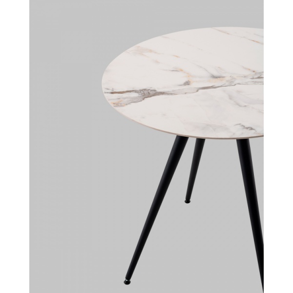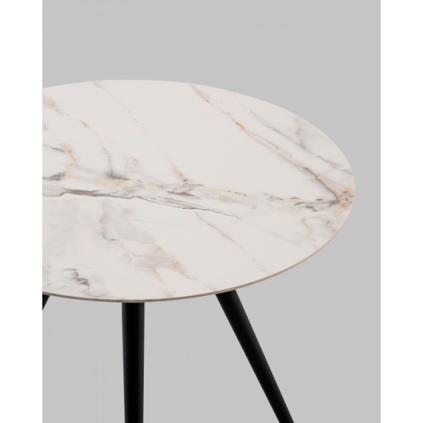 Материалы и конструкция. Столешница выполнена из прочной керамики — она устойчива к царапинам, перепадам температур и влаге, а также легко очищается. Чёрные металлические ножки обеспечивают устойчивость и визуальный контраст, подчёркивая современный характер модели.
