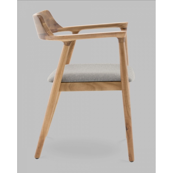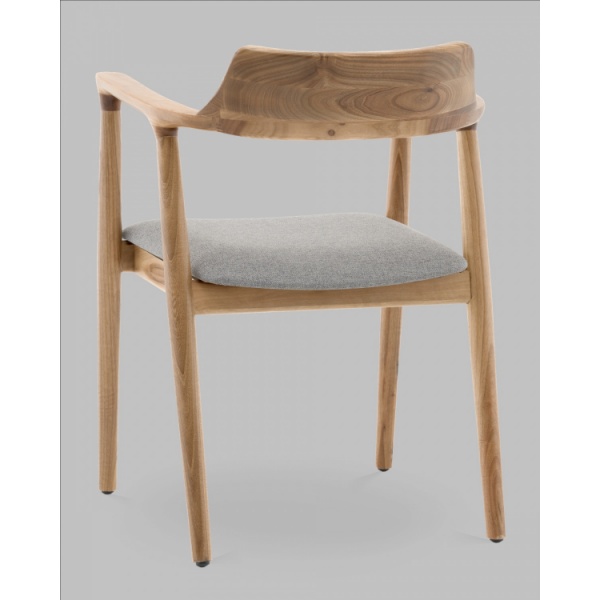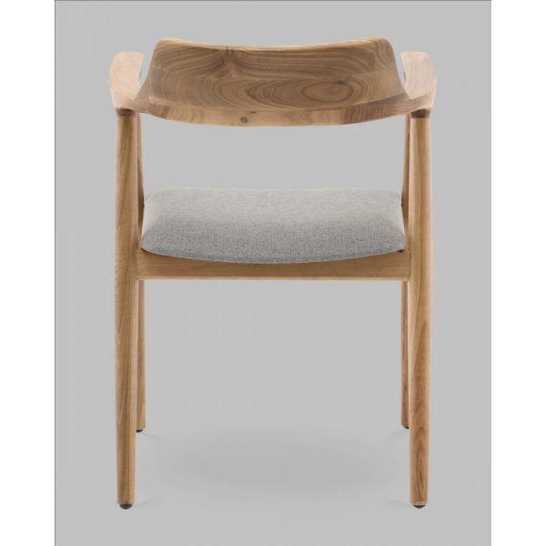 Сиденье обито светло-серой рогожкой с выразительной фактурой. Этот материал приятный на ощупь, износостойкий и отлично смотрится в интерьере. Светлый цвет сиденья создаёт контраст с тёплым тоном дерева, делая дизайн особенно свежим и современным.