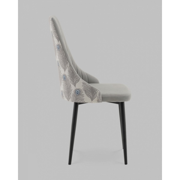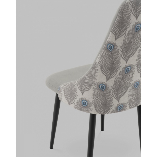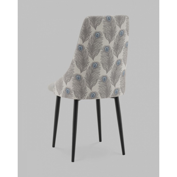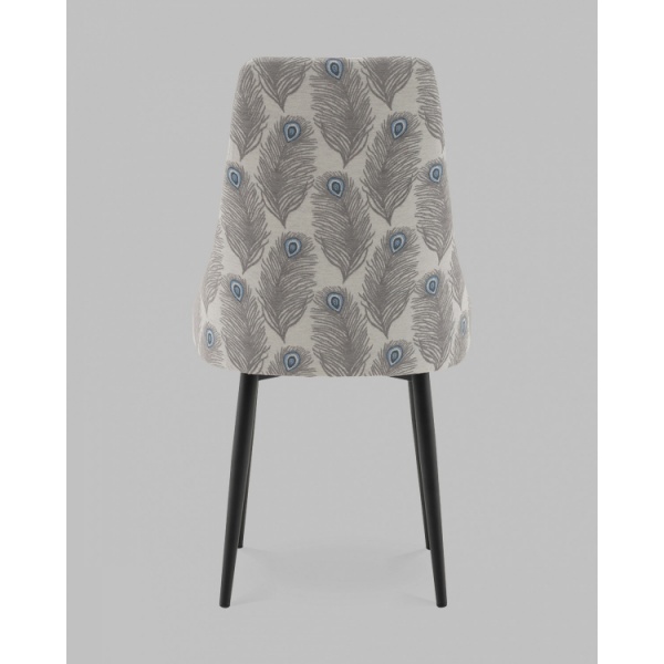 Задняя часть спинки украшена гобеленовой тканью с выразительным рисунком перьев — это изюминка модели, которая добавляет интерьеру индивидуальность и лёгкий этнический акцент. Удобное сиденье и высокая спинка обеспечивают комфортную посадку, а прочные металлические ножки в чёрном цвете гарантируют устойчивость и выдерживают нагрузку до 120 кг.